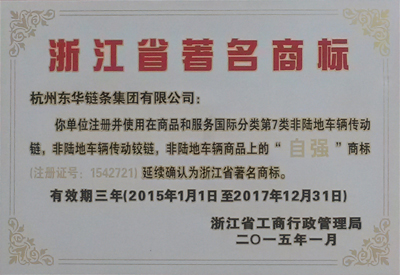 日前,由浙江省工商行政管理局認(rèn)定,我公司注冊并使用在商品和服務(wù)國際分類第7類非陸地車輛傳動鏈,非陸地車輛傳動鉸鏈,非陸地車輛商品上的“自強(qiáng)”商標(biāo)延續(xù)確認(rèn)為浙江省著名商標(biāo)。有效期為201511日至20171231日。