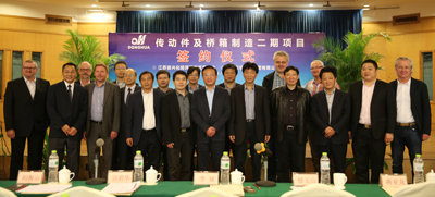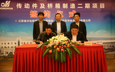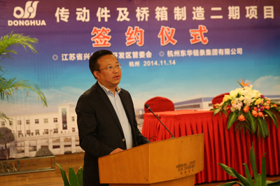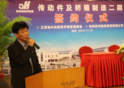 簽約儀式上,董事長宣碧華致辭。他說,東華2007年收購興化齒輪廠,至今已有8年,一直得到了興化市委、市政府和興化開發(fā)區(qū)的大力支持,使一個當(dāng)時不太景氣的企業(yè),得到了新生、發(fā)展。現(xiàn)在不僅是鏈條行業(yè),齒輪、鏈輪、變速箱、橋箱將同步發(fā)展。今天簽約的興化這個項目,我們考慮了東華發(fā)展的增量和存量。增量是我們希望到2020年生產(chǎn)總量翻一番,興化的這個土地就是我們的增量空間。存量有兩塊,一是原來我們在外采購的原材料、零部件,拿回來放在興化生產(chǎn),保證質(zhì)量;二是現(xiàn)在臨平三廠區(qū)制造鏈條要退二進(jìn)三,騰籠換鳥,把騰出來的廠房做新的項目,比如傳動件超市、輸送機械、CVT變速箱,所以今天我們在這兒舉行簽約儀式,對東華來講是一個很好的發(fā)展機會,具有里程碑意義。