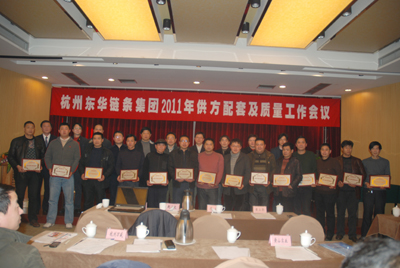 隨后,張寶康副總宣布2010年“優秀供方”與“特別貢獻獎”供方名單,與會領導向獲獎供應商頒發了證書并合影留念.杭州萬盛精拉絲有限公司崔總作為“優秀供方”代表與 杭州三志緊固件軸承有限公司屠董作為“特別貢獻獎”代表上臺作了發言。