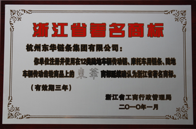日前,東華集團注冊并使用在12類陸地車輛傳動鏈、摩托車用鏈條、陸地車輛傳動齒輪商品上的“東華”商標被浙江省工商行政管理局復評為浙江省著名商標。