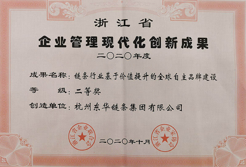 日前,公司申報的“鏈條行業基于價值提升的全球自主品牌建設”項目分別榮獲浙江省和杭州市2020年度企業管理現代化創新成果二等獎稱號,這是企業連續多年在企業管理創新成果中獲獎。