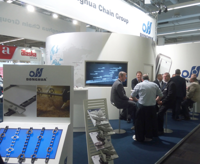 本屆展會(huì)中全球前三大農(nóng)機(jī)主機(jī)企業(yè)John-Deere、CLAAS、CNH展臺(tái)規(guī)模最大,人氣最旺。從展會(huì)上主機(jī)設(shè)備所配套的鏈條來看,東華鏈條產(chǎn)品已深入農(nóng)機(jī)主機(jī)市場(chǎng),如東華牌驅(qū)動(dòng)鏈、喂入鏈、提升鏈、玉米鏈等,在某些主機(jī)企業(yè)占比達(dá)50%以上,某些知名主機(jī)企業(yè)均用東華鏈條,占比100%。