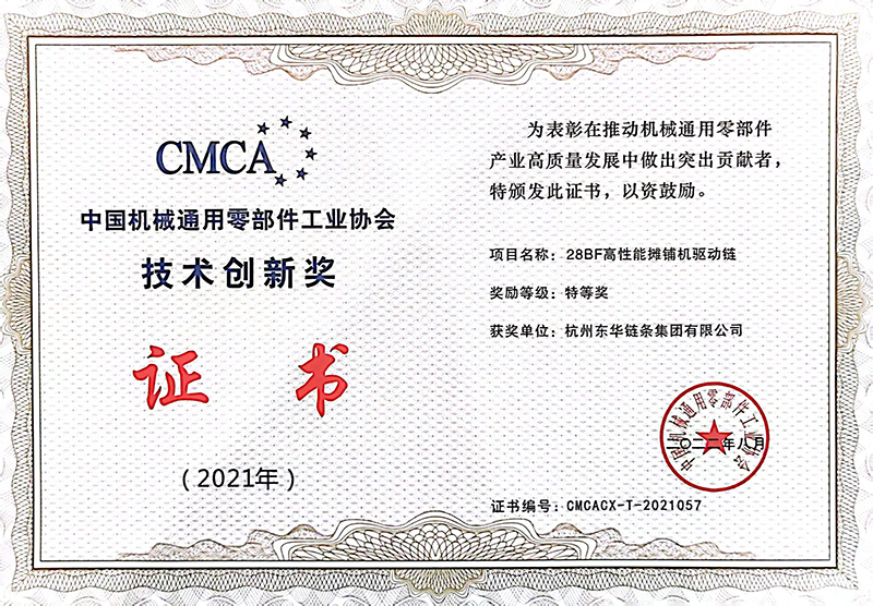 東華鏈條榮獲特等獎(jiǎng)、優(yōu)秀獎(jiǎng)各5項(xiàng)。5項(xiàng)特等獎(jiǎng)分別是:東華鏈條集團(tuán)開(kāi)發(fā)的28BF高性能攤鋪機(jī)驅(qū)動(dòng)鏈、東華興化公司開(kāi)發(fā)的32BSPF高精度高耐磨鏈條、盾牌公司開(kāi)發(fā)的P224.7F1驅(qū)動(dòng)輸送鏈和M224F-S-250地拖輸送鏈、自強(qiáng)公司開(kāi)發(fā)的C-24SSLR自潤(rùn)滑梯級(jí)鏈條;5項(xiàng)優(yōu)秀獎(jiǎng)產(chǎn)品及高端裝備分別是:東華鏈條集團(tuán)開(kāi)發(fā)的2.0T汽車(chē)發(fā)動(dòng)機(jī)用靜音鏈條、東華興化公司開(kāi)發(fā)的C2062HSSGR高耐磨輸送鏈、盾牌公司開(kāi)發(fā)的P200F280K2輸送鏈、HB50.5F41空心銷(xiāo)軸鏈條鉚頭機(jī)和PO152F48棕櫚油輸送鏈裝配機(jī)。