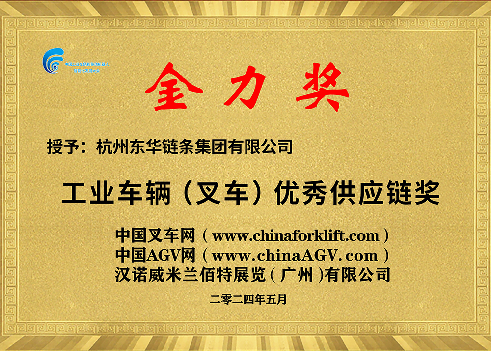 日前,2024中國工業車輛和移動機器人第二屆“金力獎”頒獎盛典在廣州舉行。東華鏈條集團憑借在板式鏈領域的卓越表現,榮獲“金力獎——優秀供應鏈獎”。