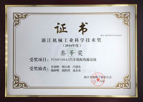 日前,在浙江省機械工業(yè)聯合會四屆四次理事(擴大)會議上傳來喜訊,東華鏈條集團所屬杭州自強鏈傳動有限公司開發(fā)的“P250F108A2汽車裝配線輸送鏈”被授予“2016年度浙江機械工業(yè)科學技術三等獎”,這是東華集團產品創(chuàng)新項目連續(xù)五年榮獲浙江機械科技獎,也是全省機械領域2016年度51項科技創(chuàng)新成果獎項中僅有的一項鏈傳動產品創(chuàng)新項目。