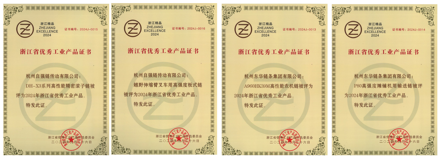 日前,浙江省優(yōu)秀工業(yè)產(chǎn)品評選委員會發(fā)布了“2024年浙江省優(yōu)秀工業(yè)產(chǎn)品”,東華四項高端產(chǎn)品榮獲“浙江省優(yōu)秀工業(yè)產(chǎn)品”稱號。分別是“DH-X3系列高性能精密滾子鏈”、“越野伸縮臂叉車用高強度板式鏈”、“A960HK39M高性能農(nóng)機鏈”、“P80高強度攤鋪機用輸送鏈”。